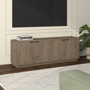 On-trend texture and design combine in this transitional TV stand. With a wood grain finish and textured fluting, this piece is sure to be a statement in your living room, den, or game room. The plinth base gives an illusion of a seamless transition from your floor, while the rounded front corners create a softer modern shape. The console features 4 fully enclosed doors with 4 inner shelves, allowing for ample storage for your devices, games, books, and more. Brayden Studio Colour: Grey