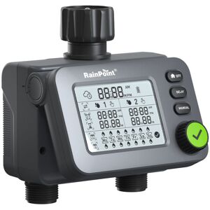【Water inlet made of high quality material】 Rugged and durable for improved durability, it can withstand up to 116 psi. The built-in metal filter gasket effectively prevents sediment and other larger particles from entering the irrigation system. 【2 independent programmable zones】The RAINPOINT water timer has 2 large outlets (flow rate from 5 to 35 liters/minute), allowing you to customize the watering schedule (start time, frequency and duration) for each zone, giving you complete control over watering each area of your garden and lawn, watering your lawn evenly, efficiently and effortlessly! Large LCD Screen: The faucet timer has an easy-to-read 2.95-inch LED screen that displays watering time, watering frequency, power and other details in a convenient and easy-to-read way. 【Rain delay and manual mode】Using the rain delay mode, your programmed program will be paused for 24, 48, or 72 hours, then resume automatically. Manual mode allows you to water any lawn or garden as needed,