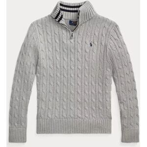 A smart pick for when temperatures dip, this cable-knit jumper is made from combed cotton and embroidered with our signature Pony. 100% cotton. Machine washable. By choosing our cotton products, you're supporting our investment in the Better Cotton™ mission to help cotton communities survive and thrive while protecting and restoring the environment. This product is sourced via a mass balance system and therefore may not contain Better Cotton™. Visit bettercotton.org/massbalance for more information about mass balance. Signature embroidered Pony on the left chest. Rib-knit mockneck with striped facing. Quarter-zip placket. Long sleeves with rib-knit cuffs. Rib-knit hem.