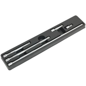 Sealey Premier Extension Bar Set 3/8"Sq Drive 5pc Features: Forged Chrome Vanadium steel shafts, heat treated and chrome plated with mirror finish. Deep knurling on shafts allow extra grip when spinning off fixings. Spring-ball socket retainers. Supplied in storage tray. Technical Details: • Forged Chrome Vanadium steel shafts, heat treated and chrome plated with mirror finish. • Deep knurling on shafts allow extra grip when spinning off fixings. • Spring-ball socket retainers. • Sizes: 38, 75, 150, 250, 450mm. • Lifetime guarantee*. • Model No. AK6341 • Model No. AK6341 Additional Information: • One of a comprehensive range of Premier Hand Tools, suitable for daily professional use. • Forged Chrome Vanadium steel shafts, heat treated and chrome plated with mirror finish. • Deep knurling on shafts allow extra grip when spinning off fixings. • Spring-ball socket retainers. • Sizes: 38, 75, 150, 250, 450mm. • Supplied in storage tray. • Lifetime guarantee*.