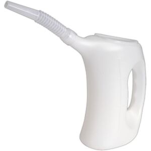 Sealey: Measuring Jug with Flexible Spout 2L Wide mouthed tin-plated jug with flexible metal spout. Handle for safe and easy pouring. Robust and stable ergonomic design. Manufactured from hard-wearing polyethylene - resistant to oil, fuel and most acids. Removable flexible spout. Scales on these jugs are for indication purposes only. MPN: J2F EAN: 5024209383738 Measuring Jug with Flexible Spout 2L Attributes: Capacity: 2L MFR Part No.: J2F Nett Weight: 0.18kg
