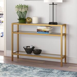 Bring a streamlined style to your space with this modern console table. Crafted of steel in a matte finish, this console table strikes a three-tiered rectangular silhouette on four straight square legs. Two clear, tempered glass lower shelves are perfect for stacking go-to reads and displaying collected curios, while the matching glass tabletop provides a perfect platform for framed photos or a pair of stylish lamps. Blue Elephant Table Base Colour: Brass