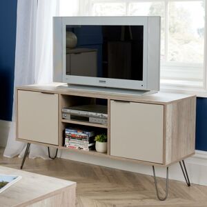 Industial styling and functional, this TV unit features plenty of storage in a combination of driftwood and calico effect finishes in easy to clean melamine with real metal handles and feet. This 2 door flat screen TV unit features plenty of space for all your TV related bits and pieces. There are cupboards at either end with doors meaning you can hide all your paraphernalia away tidily out of view. The central area has a shelf halfway down allowing you to accommodate satellite, internet or TV boxes with open access to the rear of the cabinet for locating cables without having to struggle. With Big Furniture Warehouse you can be assured of real value for money, the latest on trend focused furniture designs along with exceptional customer service. Size = (W) 114.5cm (D) 39.5cm (H) 57cm