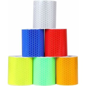 Microprismatic reflective adhesive tape in a 30 meter roll of 50mm width is the solution for application on static or moving surfaces that require high visibility at all times. Ideal for objects such as poles, barricades, posts, machinery, floors, clothing, and moving objects such as buses, trucks, motorcycles, boats, and more. The high performance level of microprisms is attributed to the three-point micro-designed prisms that cover the entire surface. Because the cone of light is more concentrated, it is a much more effective reflective tape. The seal prevents any kind of infiltration (water, dust, etc.) and ensures a long lifespan. Application is possible on any smooth, clean and dry flat surface. The package includes 6 rolls of tapes in different colors: White, Yellow, Red and Blue, Gold, Green. Specification: Material: PVC Color: White + Fluorescent Yellow + Red + Blue + Gold + Green Quantity: 6 Rolls Dimensions: 50mm x 3m Package Includes: 1x Reflective Tape in White 1x