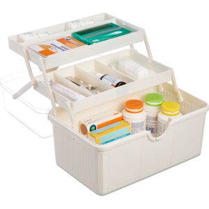 This first aid storage box is ideal for keeping your home medicine cabinet tidy. With seven compartments of different sizes, including one XXL compartment, medicines, bandages and plasters are always neatly sorted and quickly accessible in an emergency. The medicine case is an indispensable companion in households, hotels, offices, sports clubs and schools. Thanks to its carrying handle, the lightweight medicine box is easy to transport. Medicine Storage Box in Detail - Dimensions H x W x D: approx. 20.5 x 30 x 21 cm - 2 compartments on upper level H x W x D: approx. 2.5 x 26.5 x 4.5/10.5 cm - 4 compartments on middle shelf H x W x D: approx. 2.5 x 5.5/10 x 14.5 cm - 1x large compartment H x W x D: approx. 12.5 x 29.5 x 18 cm - Weight: approx. 0.5 kg - Material: Plastic - Colour: White, transparent Empty First Aid Kit for Emergencies - For sorting medicines and bandages - 7 different compartments for organised storage - Handy and quick to use in emergency situations - Practical