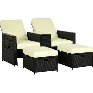 This Outsunny set combines reclining garden furniture, with storage and most importantly, somewhere to relax with a friend. It comes with two reclining chairs, two storage footstools and a tempered glass-top table. Both chairs feature a reclining back: set to five different angles so you can relax the way you want to. A steel frame forms each piece for strong support, wrapped in stylish plastic rattan: a garden-ready look to be used this season and beyond. Specifications: ● Colour: Khaki, Beige ● Material: Steel, PE Rattan, Polyester ● Lounger dimension: 71L x 58W x 90Hcm ● Footstool dimension: 47W x 60D x 30Hcm ● Side table dimension: 71L x 25W x 62Hcm ● Seat size: 50W x 60Dcm ● Seat height: 33cm ● Weight capacity: 120kg(per seat), 30kg(table) ● Item label: 862-067V71BG Just so you know: this item ships and arrives in separate boxes. Delivery times may vary with each box. Box quantity: 2 Features: ● Five-piece set: two reclining chairs, two storage footstools and a tempered glass-top