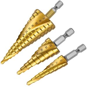 【MULTI-SIZE】: 1pc 15-step drill bit (4-32mm), 1pc 9-step drill bit (4-20mm), 1pc 13-step drill bit (4-12mm). Three sizes are available to meet your needs. 【QUALITY MATERIALS】: Classic high-speed steel, titanium coating on the surface, proven performance and durability in drilling holes in plastics, wood, aluminum, copper, stainless steel and many other types of sheet metal. Titanium alloy drill bits are especially suitable for processing copper and aluminum parts / die steel / spring steel / cast iron parts / iron and other metal materials. 【PRECISE POSITIONING DRILL BIT】: When you press the surface, it produces automatic, high-impact, spring-loaded striking force, and an adjustable hood can adjust the striking force. 【LASER ENGRAVING】: The size is laser engraved into the metal, so it will not wear out even if it is reused, making it easy to drill accurately.