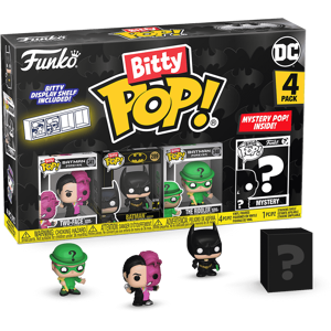 Your favorite Pops! have been shrunk into Bitty Pops! Expand your DC collection with this assortment of Bitty Pop! figures featuring your most beloved heroes and villains! This 4-pack includes Bitty Pop! Batman - 1989, Bitty Pop! The Joker - Batman 1989, Bitty Pop! Catwoman - Batman Returns, and a mystery Bitty Pop! figure. The possible mystery Bitty Pops! are Hyper Rare (1/6) Batman - Justice League, Hyper Rare (1/6) Batman - Batman v Superman, Rare (1/3) The Joker - Batman 1989 (Makeup), and Rare (1/3) Mr. Freeze - Batman & Robin (Metallic).Bitty Pops! are packaged in hard acrylic cases with detachable bottom lids. Detachable bottom lids double as acrylic bases, to which the Bitty Pop! figures are adhered. Vinyl figures are approximately 2.25 centimeters tall. Four figures per single package purchase.Warning: Choking Hazard. Collectibles are small. Not for children under the age of 3 years old. Item selection is random, as each piece is in blind packaging. We cannot accept requests for specific items. You may receive duplicate figures.