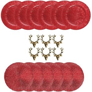 Red and Gold Bundle Set: This Christmas, add a luxury and contemporary touch to your Christmas table with this amazing table set that includes 6 charger plates, 6 placemats and 6 napkin rings. Charger Plate: Charger Plates are designed for protect and decorate your table and come in handy in a busy Christmas time. 33cm diameter. Placemats: Protect your Christmas table from spillages and damage with these six round placemats, in a festive red glitter design. 42cm x 30cm. Napkin Rings: Add that finishing touch to your Christmas table this year. These are the little details which make for an exquisite table setting. Slip your napkins into these handy and luxurious gold stag napkin rings to be presented aesthetically on your dinner plate, ready for your guests to use. Sets are prepacked, quantities and items cannot be altered or substituted.