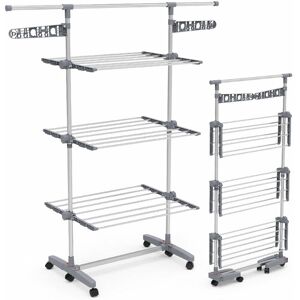 ADVANTAGES Foldable and compact Quick to install Easy to move with the presence of 6 wheels DESCRIPTION Our 3 tier drying rack is made of high quality stainless steel and sturdy plastic, offers you a drying length of 22m which is enough space to dry the clothes of whole family. The 6 foldable shelves create additional space for drying if necessary. The total arier can bear up to 30 kg. The height of each tier can be adjusted individually. The 2 side wings are ideal for hanging long dresses or suits. 6 castors make your airer more flexibly and easy to move. It can be folded when not in use. During nice sunny days, you can use it indoor or outdoor. Our clothes airer is equipped with an extendable telescopic rod at the top to hang up bed linen. The bottom bar helps to provide better stability. Easy to assemble. The size: 73 x 56 x 160cm(29*22*63in) SPECIFICATIONS: Dimension: 144 x 160 x 56 cm Folded dimension: 73 x 160 x 16 cm Material: stainless steel, plastic Carrying capacity: 30 kg