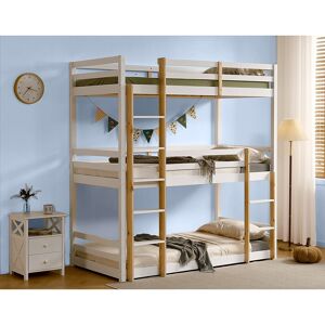 The Catlin Lydia Triple Bunk Bed is a smart solution for shared bedrooms or sleepovers, combining functionality with robust craftsmanship. Built from solid rubberwood, its three-tier design saves floor space while providing secure sleeping quarters for kids and teens, complete with safety guardrails on every level. The neutral wood finish blends effortlessly with existing furniture, and each bunk accommodates standard single mattresses (not included). Ideal for growing families, this bed prioritizes safety, durability, and space efficiency—without compromising on style. Harriet Bee