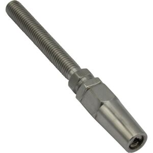 Specifications: Product Code: SFSSSSS03A Product Weight: 0.04kg Swageless Screwed Terminal Suits Wire Diameter - 3MM Thread Size - 5MM Metal - 316 Grade Stainless Steel Product Code A (MM) B (MM) C (MM) D (MM) E (MM) SFSSSSS03 3 12 6 48 41 SFSSSSS03A 3 12 5 41 41 SFSSSSS04 4 14 8 56 45 SFSSSSS04A 4 14 6 46 48 SFSSSSS05 5 17 10 63 55 SFSSSSS05A 5 16 8 57 56 SFSSSSS06 6 19 12 79 61 SFSSSSS06A 6 19 10 62 63 SFSSSSS08 8 24 16 98 86 SFSSSSS08A 8 24 14 87 82 Our Stainless Steel Swageless Screwed Terminals are used to terminate wire rope. They are manufactured from 316 Grade Stainless Steel which gives them excellent long lasting corrosion resistance. These swageless terminals are easier to use than 'Swaged' versions as they do not require any additional tools. This allows for an easy installation wherever you may require, such as onsite or in the home. A professional looking wire balustrade has never been easier to achieve. *Please note these should always be installed by a competent