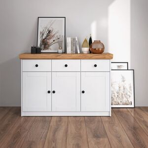 Create plenty of storage space with this white sideboard in a country house style. The white chest of drawers has 6 compartments and 3 pull -out drawers, providing plenty of space. Whether in the living room, bedroom, dining room or hallway, the free-standing solid chest of drawers fits into any room and various other furniture thanks to its subtle design. Simple black handles make the white sideboard stand out in style. Brambly Cottage