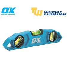 The OX Pro Torpedo Level is ideal for levelling up in areas with limited access. Featuring three solid block vials with lifetime warranty, a strong aircraft grade aluminium profile for strength with fine milled lower edge incorporating rare-earth magnets and V-groove for accurate and easy placement on pipes and curved surfaces allowing hands free levelling. FEATURES Die-cast aluminium body 3 Solid block vials Fine milled surface with V-groove Rare earth magnets for strong grip to metal surface Accuracy