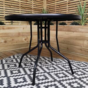 Relax and enjoy your leisure time this summer with this attractive 4 seater glass top outdoor table. This stunning table will become the focal point to your garden, terrace or patio area making it ideal for dining on or just enjoying drinks in the summer sun and has space for up to 4 seats. A garden table is a great reason to get outdoors and unwind with family or friends. The sleek and contemporary design is sure to compliment any garden setting and any existing furniture. This modern table top has a Black tempered glass top with 4 sturdy legs made from steel and finished with a Black powder coating making this table strong and durable. In the centre of the table features a parasol hole with a diameter of 5cm allowing you to use this with a parasol of your choice so you can enjoy the table with the benefit of shade. The table is supplied flat packed and self assembly is required with instructions included. Product dimensions: Table top Diameter 90cm Table top thickness: 4cm Table Height 70cm Leg thickness 3cm Parasol hole Diameter 5cm. 17 Stories