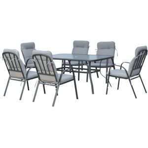 Enjoy your socialising time outdoors comfortably - look to this garden table and chairs set from Outsunny. Comes with six padded armchairs and a tempered glass-top table. Steel frames make each piece strong. High backs and armrests on the chairs for support, with a padded seat for comfort. The table is fitted with a tempered glass tabletop - comes with a middle hole to hold a parasol umbrella in place (Ф38 mm sized pole). Specifications: ● Colour: Grey ● Material: Steel, Texteline, Polyester ● Table Dimension: 71H x 152.5L x 96.5W cm ● Chair Dimension: 92H x 55W x 70.5D cm ● Seat Size: 46W x 44.5D cm ● Seat to Floor Height (without cushion): 40 cm ● Weight Capacity: 50 kg (Table), 120 kg (Chair) ● Item Label: 84G-127V01BK Just so you know: this item ships and arrives in separate boxes. Delivery times may vary with each box. Box quantity: 4 Features: ● Seven-piece balcony furniture set: six chairs and dining table ● Steel frames are strong and supportive ● Middle dining table - glass
