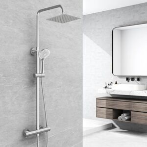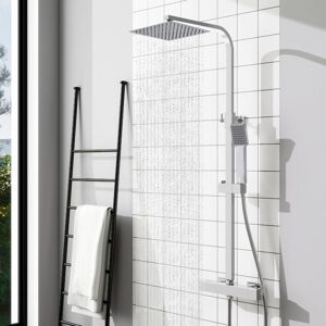 Description: Specifications Product name: Square Thermostatic Shower Set Valve: Brass construction Anti-scalding: Built in device Child friendly: Anti-scalding device Temperature range: 20-90 degrees C Dual control: Thermostatic and water-flow Shower head size: 8 inch (200mm) Shower head: Matt Joint: Adjustable swivel Slider rail: Solid brass Adjustable: Yes Handset: Black ABS handset Hose: 1.5m Nozzles: Easy clean rubber nozzles Controls: 2 Fittings: Yes Sizing: UK standard size Package Weight: 3.8KG Subject to a minimum pressure of 0.05bar to maximum 0.5bar Combination boiler systems Gravity-fed systems (only with a pump) MegaFlo systems Pumped hot water systems Un-vented hot water systems Standard pressurised hot water cylinder type systems Package Contents Thermostatic mixer bar valve Riser rail Shower head Handset shower 1.5m shower hose Fittings included