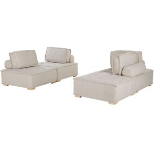 Beige Sectional Sofa Set. Make your living room even more comfortable, and complete its look with a modular sofa set. Fully upholstered in easy-care fabric, the pieces feature solid wood legs equipped with felt pads for extra stability. They boast the timeless button tufting, which together with the classic piping, offers a traditional look that goes perfectly with minimalist and Scandinavian interiors. The backrest features a thickly padded cushion with a removable cover, that can be removed to uncover a smaller one perfect for lounging. Each module has inbuilt connectors to make sure the whole set stays together. Details: Product Type: Modular Sofa Style: Modern General Color: Beige, Brown Shade: Light Beige Material Type: Fabric Main Material: Fabric Additional Material: Rubberwood Filling Material: Foam Material Composition: 100% Polyester Shape: Rectangular Arm Style: Armless Fabric Upholstered Back: Yes Leg Caps/ Pads: Yes Pattern: Solid Seat Construction: Wood Seat Foam