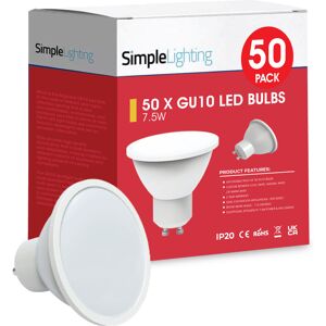 Super-Pack of 50 GU10 Bulbs Are you preparing for an upcoming build or planning a major renovation of your home? If so, you need to try out this super-pack! In this bundle, you get not just ten, twenty, or thirty but a whopping fifty GU10 LED bulbs, which are perfect for light fixtures with a GU10 lamp holder! In addition, the GU10 bulbs in this super-pack have an extended average lifespan of 20,000 hours , which is ten times longer than a traditional incandescent or halogen bulb. So, if your goal is to lower your electrical consumption without exchanging the opportunity to have a beautifully radiant and functional space, you need to get this GU10 LED light bulb! Please note - these GU10 lamps are suitable only for open light fittings. If you cover with loft insulation or install inside a light fitting which is completely sealed, it will void the warranty. Example of this would be the "black can" style fire rated downlights, where the back of the unit is a solid metal can and the heat has no way to escape. Select Between Cool White, Natural White or Warm White You can get this GU10 LED bulb in three colour temperatures: cool white, natural white, and warm white light . How do you determine which colour is which? Here's a simple guide! Cool white light has a crisp bluish tint and is generally used for task lighting. Alternatively, natural white light has no traces of blue or yellow, resembling a cloudless sunny day. Similar to cool white, natural white is also utilised for task lighting. You see, some people find cool white to be too blue, so they choose natural white as an alternative. As for warm white light, it has a yellowish shade and is mainly used for ambient lighting as it can create a welcoming and relaxing environment! Unrivalled Efficiency! 7.5w Power & 700 Lumens Many homes and establishments use LED lighting because of its many benefits. It is long-lasting, eco-friendly, cost-effective, and low-maintenance. Above all, it is energy-efficient! LED fittings can convert most of the electricity they consume into light, with a relatively small portion ending up as waste (heat). As a result, even if they have a rather low wattage requirement, they can still display exceptional brilliance! Powered by that same technology, this GU10 LED bulb can produce 700 lumens maximum luminance while only requiring 7.5w . Finding a halogen or incandescent bulb with the same brightness level that runs at 7.5w only will be challenging. So, if you want a bright space without a high electricity bill, get this GU10 bulb! Wide Beam Angle - 110 Degrees Have you heard that the beam angle affects the appearance of your light? A broader beam angle creates a feathered glow, while a slimmer beam angle produces a more intense shine. This GU10 LED bulb has a wide 110-degree beam angle , which is perfect for general or ambient lighting. Because of its extensive range, one bulb can immediately brighten the space! While this GU10 bulb is ideal...
