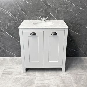 Salisbury Traditional Vanity Unit with Marble Worktop & Basin Salisbury 800mm vanity unit Light grey oak, in a soft vinyl finish Tongue and grooved sides Constructed from high quality MDF Includes decorative cup style handles Unlike many manufacturers our unit come ready assembled (not flat pack) Includes Savoy marble finish natural stone worktop With built in basin 1 tap hole (pre drilled) Ceramic inset basin including overflow The overflow is located on the opposite side to the tap for aesthetic purposes Including chrome click clack basin waste Unit Sizes approx: Width: 790mm Depth: 500mm Height: 870mm Worktop size approx: Width 790mm Depth: 508mm Optional Cammie Traditional Basin Mono Mixer Tap Ceramic disc quarter turn technology Luxury traditional style Basin mono mixer tap Cross head style Chrome plated Manufactured from solid brass Complete with washers & nuts Deck mounted for use on one tap hole basins High quality Brand new & fully boxed Comes complete with click-clack basin