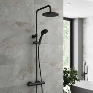 GENERAL DESCRIPTION This matte black thermostatic mixer shower from Aquari adds style to the bathroom, especially for contemporary designs. The matte black finish distinguishes it from traditional chrome showers, making it a stylish and functional addition to modern bathrooms. Features and Benefits: Matte black finish with exposed design round bar shower valve and thermostatic control. Durable solid brass valve. Large 225mm round drencher head for a rainfall experience. Adjustable shower handset for hard-to-reach areas. Diverter valve for switching between handset and drencher head. Two separate controls for temperature and flow rate adjustment. Adjustable height riser rail. 10-year guarantee for peace of mind. TECHNICAL SPECIFICATIONS Pipe Centres: 150mm +/- 18mm Inlet Connection Size: G1/2' & G3/4' Suitable for high pressure and combination boiler water systems Minimum Bar Pressure: 0.5 Bar Maximum Bar Pressure: 5.0 Bar Tube Diameter: 24mm / 21.5mm Shower Hose Length: 1500mm Shower
