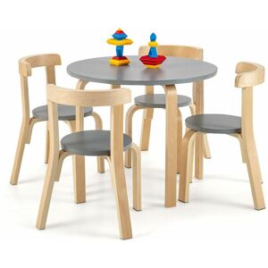 Our kids table and chair set comes with a round table and 4 chairs. With scientific height, your kids can sit comfortably when playing, eating, reading, drawing and more. Also, the chairs are equipped with curved backrests to help kids gain a healthy sitting posture. Made of premium materials, the solid wood frame has high weight capacity and long service life. Besides, the non-slip foot pads add additional stability while sitting. The waterproof and smooth surface is easy to clean. Moreover, the chairs can be pushed under the table completely or stacked on the tabletop for storage. This kids table and chair set is not only suitable for home, but also ideal for kindergarten, daycare and classroom. It is the perfect gift for your kids over 4 years old. Features:5-piece kids table and chair set includes a round table and 4 chairs Easy to store with space-saving design Smooth and waterproof surface for convenient cleaning Designed with rounded edges for safety of kids Comfortable to sit