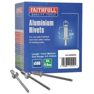 Rivets are generally acknowledged as the most versatile fastening method available with the benefits of secure fixing from one side. The Faithfull Pop or Blind rivets are manufactured from quality aluminium with a steel pulling mandrel. These rivets are suitable for use with most hand riveters and are RoHS compliant for use in electrical appliances.Type: AluminiumDiameter: 4.8mmLength: Long 14mmGrip range: 7.5-9.5mmPack qty: 500Additional Information:• Rivet Type: Aluminium Rivets• Diameter (mm): 4.8• Length (m): 14• Pack Qty.: 500