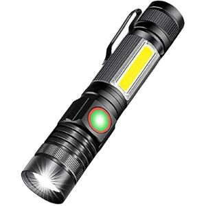 【Small but Powerful】 Bright EDC flashlight that emits up to 1,200 lumens and 600 meters of distance. Easily illuminate a room or an entire yard. Portable and lightweight, perfect for everyday carry. The pocket clip easily attaches to your hat or shoulder strap. 【USB Rechargeable & Power Indicator】 Built-in USB charging port and USB cable. Can be charged directly using a power bank or wall adapter, etc. The indicator light is red when charging and green when fully charged. 【Rugged & IPX6 Waterproof】 Its military-grade aluminum body and shockproof performance can withstand rough handling. IP65 waterproof rating, it can be used normally in bad weather like rain and snow. Widely used in daily life, power outage, camping, hiking, fishing, hunting, patrolling, dog walking, inspection and emergency use. 4 Lighting Modes & Zoom: 4 modes: high/low/strobe/slow strobe. Stretch the torch head to change the focus. Zoom out to concentrate the spotlight, zoom in to reveal a large area. [Package