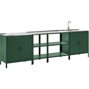 Garden Kitchen Cabinet and Island Set. An outdoor kitchen island set, designed for utter convenience, includes four pieces - two cabinets, one with a fitted sink and single lever spout, and two islands. Featuring open shelves, it is perfect for food and kitchen accessories storage. With this set, you can remain engaged with your guests while preparing meals outdoors, eliminating the need to constantly retreat to your indoor kitchen. Made from stainless steel with powder coating, the furniture is fully prepared for outdoor conditions, ensuring durability. Its practical construction includes a sink with a single mixer tap and a spacious tabletop, perfect for prepping ingredients or using as a grill station, allowing you to relish the joys of outdoor cooking. Details: Product Type: Garden Kitchen Style: Modern General Color: Green, Silver Material Type: Metal Main Material: Steel Additional Material: Stainless Steel Top Material: Metal Finish: Powder Coated Dimensions: Basin Dimensions: