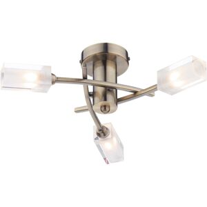 MORGAN MOR0375.ᅠ A modern semi-flush ceiling light finished in Antique Brass and complete with glass shades. FEATURES * Ceiling light * Semi-flush - suitable for lower ceilings * Suitable for dimming * Antique Brass * Glass shades SIZE * Height: 165mm * Diameter: 390mm BULBS * Takes 3x 25w (max) G9 halogen lamps - NOT INCLUDED PART NO * MOR0375