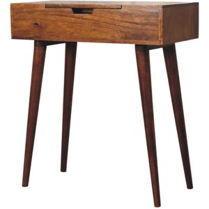 Add this beautiful dressing table to your home. Constructed from 100% solid mango wood in a chestnut finish with 1 drawer, it features a foldable mirror and storage compartments for storing any bits and pieces. Other product features - include Nordic-style legs and a cutout slot for easy access to the drawer. A lovely versatile piece that will complement any room beautifully. This petite product is part of the Recession Collection. Corrigan Studio
