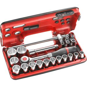 French tool manufacturers Facom are renowned for the quality of their sockets and the Detection Box carry case is a concept that helps to ensure you never lose them! Windows built into the case let you instantly identify any missing items even when closed, helping not only to avoid loss of personal or company equipment but limiting instances of foreign object damage caused by dropped or misplaced tools. Containing 19 hexagon sockets, this set is additionally supplied with a ratchet handle, extension bar and a sliding T handle.Includes:• 1 x 8mm socket• 1 x 9mm socket• 1 x 10mm socket• 1 x 11mm socket• 1 x 12mm socket• 1 x 13mm socket• 1 x 14mm socket• 1 x 15mm socket• 1 x 16mm socket• 1 x 17mm socket• 1 x 18mm socket• 1 x 19mm socket• 1 x 21mm socket• 1 x 22mm socket• 1 x 23mm socket• 1 x 24mm socket• 1 x 27mm socket• 1 x 30mm socket• 1 x 32mm socket• 1 x 1/2" Ratchet handle• 1 x 1/2" Sliding T handle• 1 x 1/2" extension bar