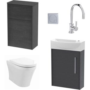 Power Cloakroom Bundle - Left Wall Hung Vanity Unit, Concealed Cistern WC Unit, Toilet & Tap, 440mm - Grey/Black - Balterley Combining the left hand Power cloakroom bundle from Balterley offers high-quality essentials in a compact, modern designIn a Matt Coastal Grey finish, with the brassware in a complementing Matt Black finish for a touch of luxury to your room. The Balterley Power Cloakroom Suite is a compact, all-in-one set designed to upgrade small bathrooms with modern style. It includes a right-hand vanity, WC unit, back to wall toilet, brushed brass tap and waste, and a concealed cistern—offering durable quality and space-saving elegance. Product Highlights: Contemporary Design: Soft coastal grey tones meet sleek matte black fittings for a clean, minimalist aesthetic in modern cloakrooms or small bathrooms. Soft Close: Fitted with a premium soft-close door mechanism, this bathroom vanity unit ensures quiet and controlled closing – enhancing durability, reducing noise, and