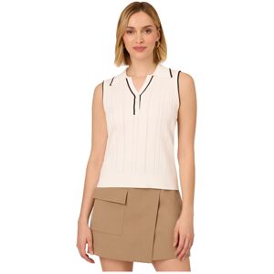From weekend plans to workday to-dos, this sleeveless sweater top will lend your outfit timeless appeal. This top features a collared y-neckline, no sleeves, and fits close to the body. Designed with a cable knit fabric that is lightweight for warm-weather wear, this sleeveless sweater hastipped trim a the neck, collar, and armholes. Scalloped edging and covered buttons at the neckline complete the look. Styled with a tennis skirt or tailored slacks, this cable knit sweater top is a staple for any wardrobe. Adrianna Papell Women's Sleeveless Open Y-Polo Mix Rib Cable Tipped Sweater in Black Size: XL