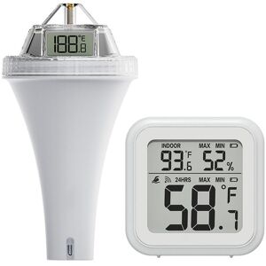 【High Waterproof Performance】: The wireless pool thermometer host adopts an improved design and is equipped with a double rubber seal. Made of high-quality and durable materials, IP68 is more waterproof, and when in use, the cover should be tightened to improve the waterproofness while preventing the LCD screen from blurring during use, Wireless transmission range up to 50 meters. (164 feet) 【Accurate Temperature Monitoring】: Floating pool thermometer display ℃ / ℉ is optional, compatible with 2x1.5V "AAA" "AAA" alkaline batteries. The temperature detection range of the indoor host is: 0 ℃ -50 ℃ and is updated every 30 seconds, and the temperature detection range of the outdoor water thermometer is: -40 ℃ -70 ℃. The transmitter frequency is 433.92 MHz, the wireless range temperature error is within ±1°C. 【Multiple Uses】: The display of the Pool WiFi thermometer is 12/24 hours optional, with a daily clock function, which is clear at a glance. The pond water temperature tester is ideal