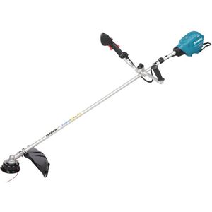 Makita UR013GZ03 XGT® 40Vmax Brush Cutter with offset bike handle and standard protector, designed for use with metal blade/plastic blade/nylon cutting head. Fitted with a powerful brushless motor and variable speed. XPT (Extreme Protection Technology) provides improved dust and water resistance for operation in harsh job site conditions. The battery protection system automatically shuts off power when the battery level is low. Comes as a bare unit, no battery or charger supplied. Specifications: No Load Speed: 3,500-6,700 /min. Cutting Diameter: 25.5 - 45cm Spindle Size: M10 x 1,25 LH Nylon Line Diameter: 2.7mm