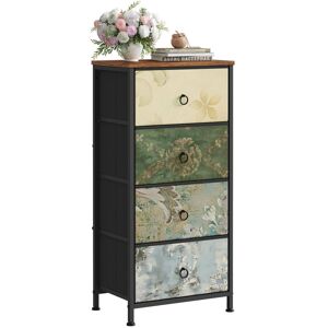 LARGE CAPACITY CHEST OF DRAWERS: This side drawer cabinet offers 4 large capacity drawers, providing ideal storage space for your clothes, blankets, toys and more. The top can be used to hold vases, ornaments, books, mobile phones, etc. UNIQUE AND CHIC LOOK: The sturdy non-woven fabric drawers are designed with retro flower patterns on the front, which is beautiful and unique. Paired with the metal ring drawer pulls, this chest of drawers is not only a practical piece of furniture, but also a perfect decorative piece STABLE AND STRONG CONSTRUCTION: The structure of this 4-drawer chest is made of metal and high-quality engineered wood; equipped with adjustable feet to keep it stable even on slightly uneven floors; the included anti-tip device provides extra stability and safety. All these ensure the longevity of the cabinet MULTIFUNCTIONAL CABINET OF DRAWERS: This drawer unit is compact and stylish, whether it's used in the bedroom, living room, children's room, hallway or cloakroom as