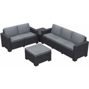 Keter California 5 Seater with 3 seater sofa and a 2 seater sofa Outdoor Garden Furniture Lounge Set - Graphite with Grey Cushions The California set is made of more than 83% recycled resin with a 6mm round wicker design. The woven wicker style creates a luxurious and trendy look and can create a focal point in any outdoor space. The set consists of one two- seater sofa and one three seater sofa both with wide deep seating, a table and square foot stool with cushion which is perfect for putting your feet up and relaxing or as an extra seating option when hosting indoor's in your conservatory, or outdoors on gardens and patio areas. The cushions included are 7.5cm thick and provide optimal seating comfort to relax and unwind. Lightweight in its structure therefore is easier to move to suit any setting and is easy and quick to assemble. The garden set is completely maintenance-free and weather-resistant, so you can enjoy the lounge set for years to come. Product Features: Ideal