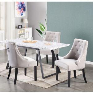 The Blaze Rectangle Dining Table Set offers a stylish blend of mid-century modern design and practicality. Featuring a sleek rectangular table with a chic black powder-coated MDF base and sculptural cross-shaped legs, this table adds a contemporary edge to any room. Its extendable design allows you to comfortably seat six people, making it perfect for daily family meals and special dinner gatherings. The table’s versatile look complements any environment, from your kitchen to your dining or living room, while its sturdy construction ensures long-lasting use. Paired with the luxurious Windsor Knocker Back Dining Chairs, this set elevates any dining space. These velvet-upholstered chairs feature elegant curves, sweeping arches, and soft edges, accented with silver detailing and diamond tufting for a touch of sophistication. The rear knocker handle not only enhances the aesthetic appeal but also provides practical functionality. The foam-filled seat and ergonomically curved backrest