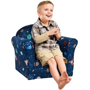 With this cool, planet-designed armchair, kids have a comfortable spot of their own, where they can play, watch TV, read and relax. Its wooden frame ensures the structure is tough and reliable, it can hold up to 45kg, whilst the thick foam is all over the chair for comfort. High back and arms add support for the body, promoting good posture – they can sit comfortably for long periods. A cool addition to their room, it gives them a personal space to sit. Specifications: ● Colour: Blue ● Material: Polyester, wood, sponge and plastic ● Dimensions: 44H x 50L x 39Wcm. Seat: 21H x 29Lx 27Wcm ● Recommended age: 3-6 years. Certificated age: 18+ months ● Weight capacity: 45kg ● Certification: EN71-1.2.3 ● Custom label: 310-034V70DB Features: ● Plush foam padding, it has a wide seat and high bac and armrests for comfort ● Solid wooden frame for stability and durability – plastic feet add balance and protects your floor ● Rounded edges for safety ● Fun space designed upholstery – a cool addition