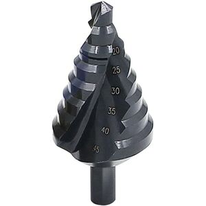HSS4241 High Speed Steel Step Drill Bit 10-45 Spiral Step Drill Bits Nitrogen Coated Made of high speed steel and nitrogen coated to reduce friction and run cooler. Spiral cutting flute; automatically deburr holes as you drill. Application: Suitable for workpieces less than 25mm hardness, such as carbon steel, sheet metal, insulation board, PVC board, plank and wood with thickness less than 5mm. 8 levels: 10mm, 15mm, 20mm, 25mm, 30mm, 35mm, 40mm, 45mm.