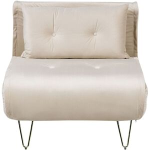 1 Seater Velvet Sleeper Sofa. Bring a glamorous feel to your interior with this functional and alluring sofa bed. Its upholstery made of durable velvet is exceptionally soft to the touch, and the thick padding makes it a truly comfortable piece. The upscale look of the furniture is emphasized with the gold metal legs. The additional cushion with button tufting and removable cover adds a bit of charm and cosiness to the couch. Moreover, thanks to the easy to operate sleeper function, you do not need to worry whenever your guests want to sleep over at your place. Details: Product Type: Single Sofa Style: Glam General Color: Beige, Gold Shade: Light Beige Material Type: Fabric Main Material: Velvet Additional Material: Iron Filling Material: Foam Material Composition: 100% Polyester Arm Style: Armless Leg Caps/ Pads: Yes Reclining: No Removable Cushion Covers: Yes Seat Construction: Sinuous Springs Seat Foam Density: 50 kg/m3 Seats Up To: 1 Person Sleeper Function: Yes Sofa Bed Open