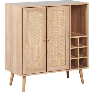 Wicker Front Sideboard with Wine Rack. This stylish sideboard combines function and flair, featuring a storage compartment behind a door with charming wicker fronts. An open shelf provides display space, while the built-in wine rack holds up to six bottles. Made from particle board with a natural wood-look finish, it’s complemented by solid wood legs for stability. Its boho-inspired design adds warmth and character to any room. Details: Product Type: Sideboard Style: Boho General Color: Brown Material Type: Engineered Wood Main Material: Particle Board Additional Material: Pine Wood Legs material: Wood Shelves number: 7 Doors Opening: Standard Drawers: No Finish: Veneered Key Locked: No Number of Doors: 2 Shelves: Yes Dimensions: Depth: 39 cm Width: 83 cm Height: 89 cm Weight: 25 kg Top Weight Capacity: 30 kg Offer Includes: 1 x Sideboard Key Features: Open Shelf for Easy Access, Features Built in Wine Rack, Wood-like Finish for Natural Look, Works Great with Many Interior Styles, For