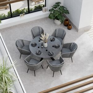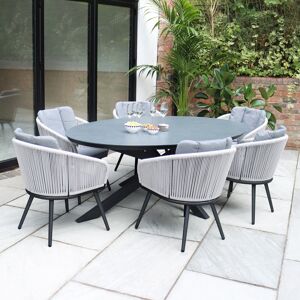 Introducing the Aspen Dining Set, featuring an impressive 200cm oval ceramic tabletop in a sleek grey finish. This expansive table is designed to accommodate larger gatherings, providing ample space for family meals, celebrations, or casual get-togethers. The durable ceramic surface not only boasts a modern look but is also resistant to stains and scratches, ensuring longevity and easy maintenance.Complementing the table are six elegantly designed rope chairs that add a contemporary touch. Each chair is crafted with a robust frame and features intricate rope weaving, offering both comfort and style. The ergonomic design ensures that guests can enjoy long meals in comfort.The Aspen Dining Set seamlessly blends functionality and aesthetics, making it the perfect centerpiece for your dining area. Create a warm and inviting atmosphere for every occasion with this stunning set that enhances any home with its chic and sophisticated vibe. Corrigan Studio
