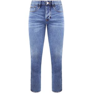 Enhance your wardrobe with the Armani Jeans J75 Slim Fit 5 Pocket Jeans in light blue, designed specifically for men. These jeans combine timeless elegance with modern details, offering a slim fit that shapes nicely through the hips and thighs, crafting a refined silhouette. Made from stretch-infused fabric, they provide ultimate comfort without sacrificing style, making them suitable for various occasions, from casual day-outs to more dressed-up events. Details: Slim fit design tailored for a sleek, masculine look Paint splatter Patched up design Classic five-pocket styling for functionality and flair Subtle branding with the Armani Jeans logo patch on the rear waistband Versatile light blue shade, perfect for pairing with diverse top and footwear options Black leather belt patch