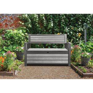 Keter Hudson Garden Storage Bench The Hudson Storage Bench is the attractive and multi-function seating option for any of your favorite outdoor areas. The bench provides comfortable seating for two adults while also providing 260 L/60 G of dry and ventilated storage space that is also lockable. The entire unit is made out of a unique durable and weather-resistant resin that resists damage and keeps this piece low-maintenance while also giving it the classic look and feel of wood. Product Features: Ideal outdoor storage box for garden tools and equipment, furniture cushions, garden games and accessories Decorative brushed-wood panel-style finishing with 270L capacity keeping all items ventilated and dry Piston-assisted lid, comfortably seats two adults and has lockable option for added security Made of durable, weather-resistant and maintenance fade-free plastic Assembled external dimensions: 132.7 x 61.2 x 89 cm (L x W x H); internal dimensions: 126 x 52 x 38 cm (L x W x H) Product