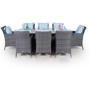 The Savannah fire pit garden set consists of a feature packed 200cm gas fire pit table, 8 luxury padded dining chairs and all weather cover. This outdoor rattan dining set is available in a stunning mixed brown weave or the stylish mixed grey weave. The statement feature of this stunning 8 seater rattan dining set is the 200cm fire pit dining table. The rectangle rattan dining table comes complete with an electronic ignition control panel featuring adjustable heat settings, tempered glass safety shield, stainless steel cover, decorative long lustre fire glass and BBQ griddle. This gas fire pit produces over 40,000 BTU’s, our fire pits for garden can function hot enough to grill food and low enough to provide a long lasting relaxed ambience. This 8 seater rattan dining table and chairs set features 5cm thick seat cushions and 4cm thick contoured back cushions, the multi density fillings enhance the shape and structure of the cushions to provide comfort and support to your seating arrangement. The Savannah garden furniture set is made using rustproof aluminium frames and polyethylene all weather rattan, making this outdoor rattan dining furniture strong, light-weight and corrosion resistant. The rattan dining chairs come fully assembled and the impressive synthetic wicker furniture material is UV resistant, able to withstand temperatures from -15 degrees celsius to 60 degrees celsius. A damp cloth or garden hose on a gentle setting is all that's needed to maintain this rattan furniture. Lark Manor Frame Colour: Grey, Cushion Colour: Grey/Light Blue