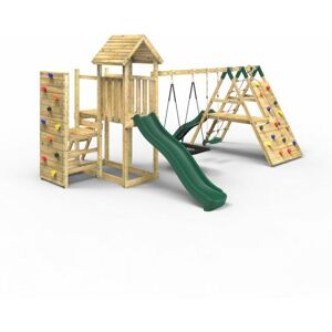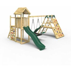 This extended deck adds extra room as well as fun to the standard Rebo climbing frame tower. Double width, there is both a wooden ladder and climbing wall to access the deck which comes with the upgraded wooden roof as standard. But the fun doesn’t stop there, it has an 8ft (2.20m) injection moulded slide with built in waterslide feature as well as a range of different swing arm options. Designed and made in the UK from pressure treated timber these sturdy climbing frames are built to last and help inspire hundreds of back garden adventures for years to come. Please Note: Tools are required in the assembly of this item including a drill, wood is not pre-drilled but full instructions are provided.