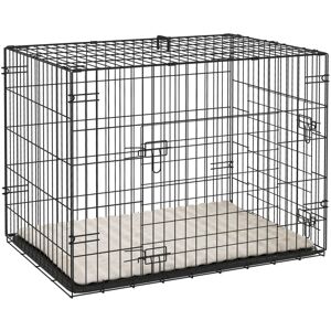 Crate training offers dogs security and gives you peace of mind. This PawHut dog crate is great for large dogs and below. It features a removable, washable cushion for comfort, an easy-to-clean tray for hygiene and a foldable design with a plastic handle for simple storage and transport. Suitable for training puppies, providing a safe haven for senior dogs or giving you a break, it simplifies life for both pets and owners. Specifications: ● Colour: Black and beige ● Material: Steel, ABS and polyester ● Overall dimensions: 68H x 91L x 62Wcm ● Folded: 8.5H x 91L x 62Wcm ● Door Size: 47H x 44Wcm (Front), 47H x 50Lcm (Side) ● Tray: 3H x 89.5L x 59.5Wcm ● Cushion: 1.2H x 86L x 56Wcm ● Bar spacing: 3cm ● Item label: D00-033V00BG Features: ● Front and side doors for easy access, with side-bolt latches to keep them securely inside when needed ● Folds easily with a plastic handle for carrying ● Removable ABS pan for simple cleaning ● Washable soft cushion for added comfort ● Strong metal frame