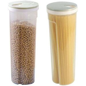 Dimensions: 28 x 10 x 8 cm. Material: food-grade polypropylene. Strong, waterproof, moisture-proof, corrosion-resistant, and mothproof. Transparent, easy to use and clean. Two rotating holes of different sizes for outlet control. Food storage boxes keep food fresh longer. Great for storing noodles, cookies, sugar, flour, spices, frozen meals, and other kitchen supplies.